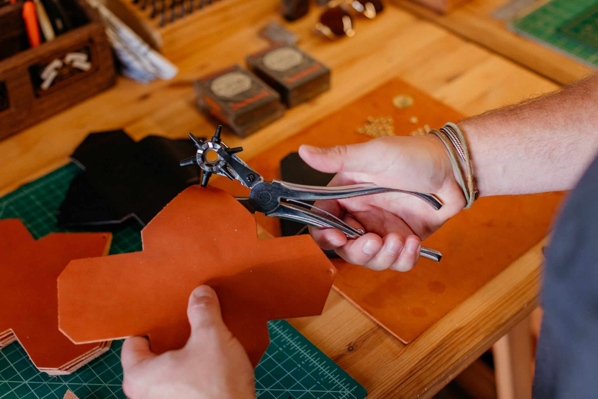 The leather that we source is also vegetable tanned, which is a traditional method used by skilled craftspeople that uses organic and biodegradable materials. It is more difficult and takes more time than alternative chemical-based methods, but results in gorgeous, heritage-quality leather hides.
