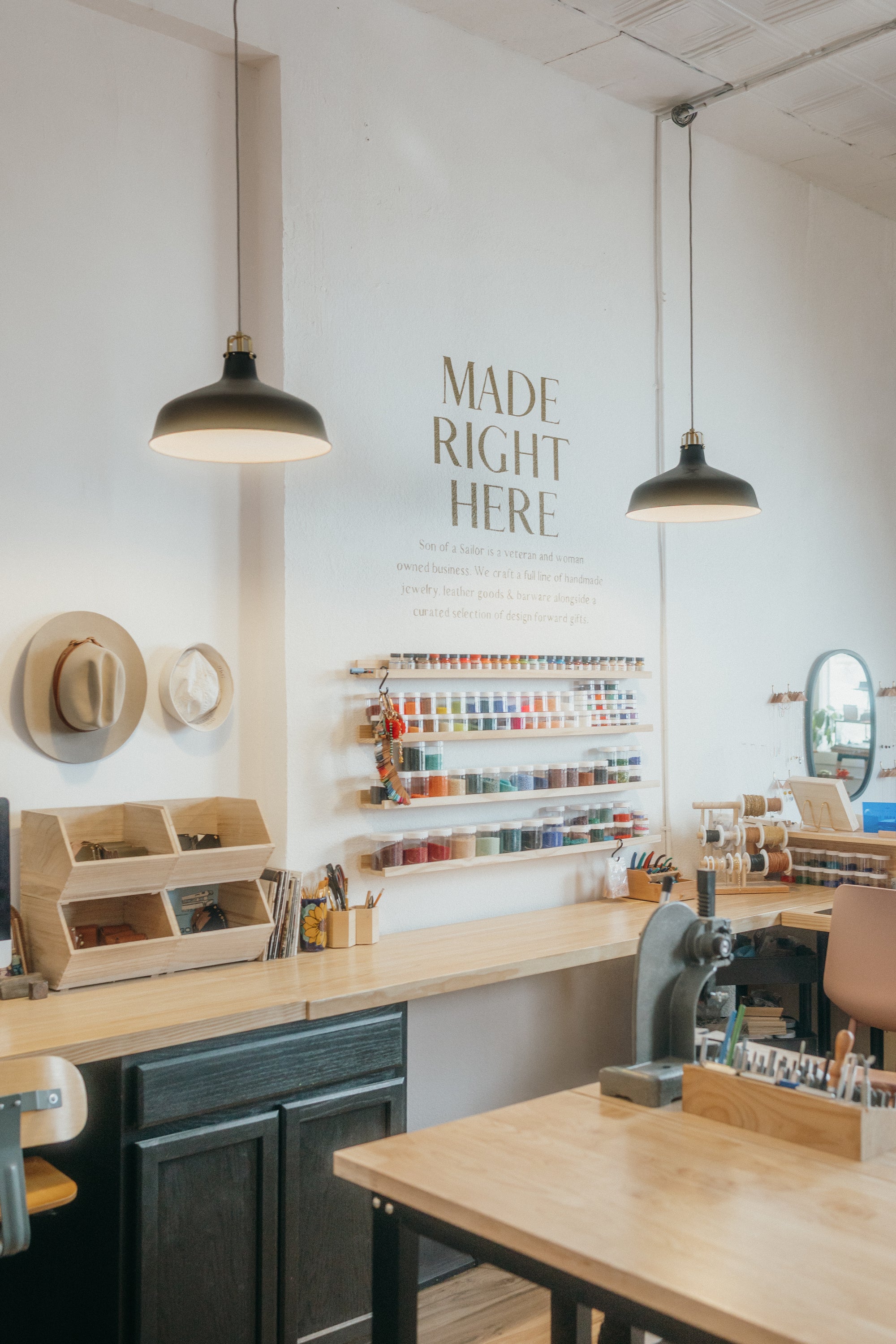 The front of house is a curated storefront where other design-led brands are merchandised alongside Son of a Sailor goods, but peek at the back of the shop and you'll see where all the magic is made!