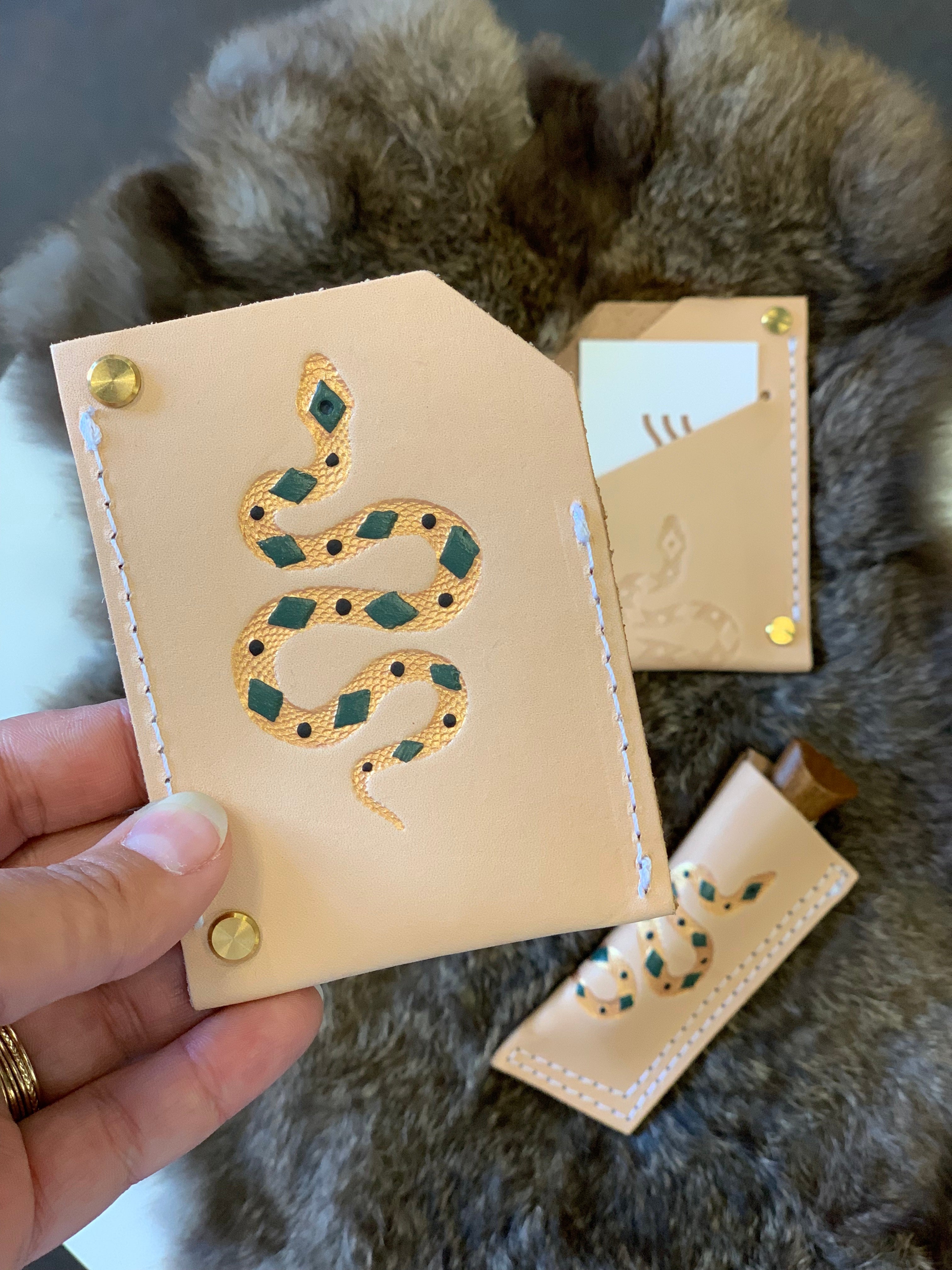 This technique uses high pressure to impress a custom made stamp into leather, resulting in an embossed relief of the design.