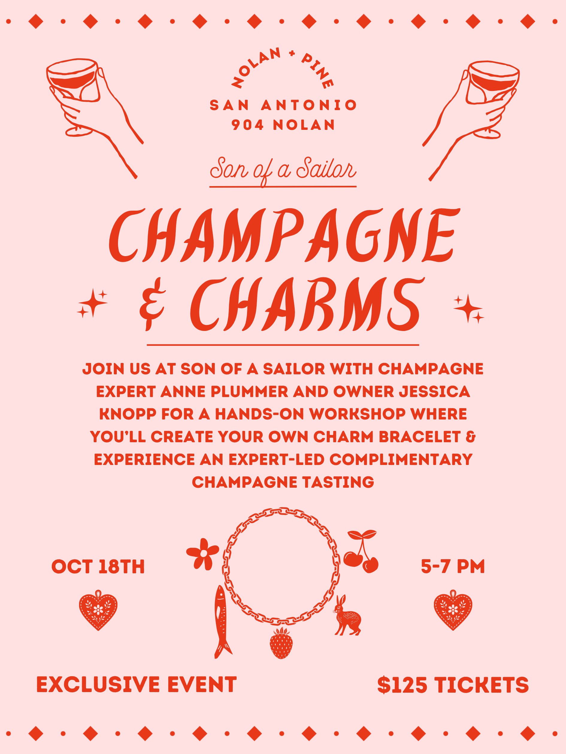 Join us at Son of a Sailor with champagne expert Anne Plummer and owner Jessica Knopp for a hands-on workshop where you’ll create your own charm bracelet & experience an expert-led complimentary champagne tasting.