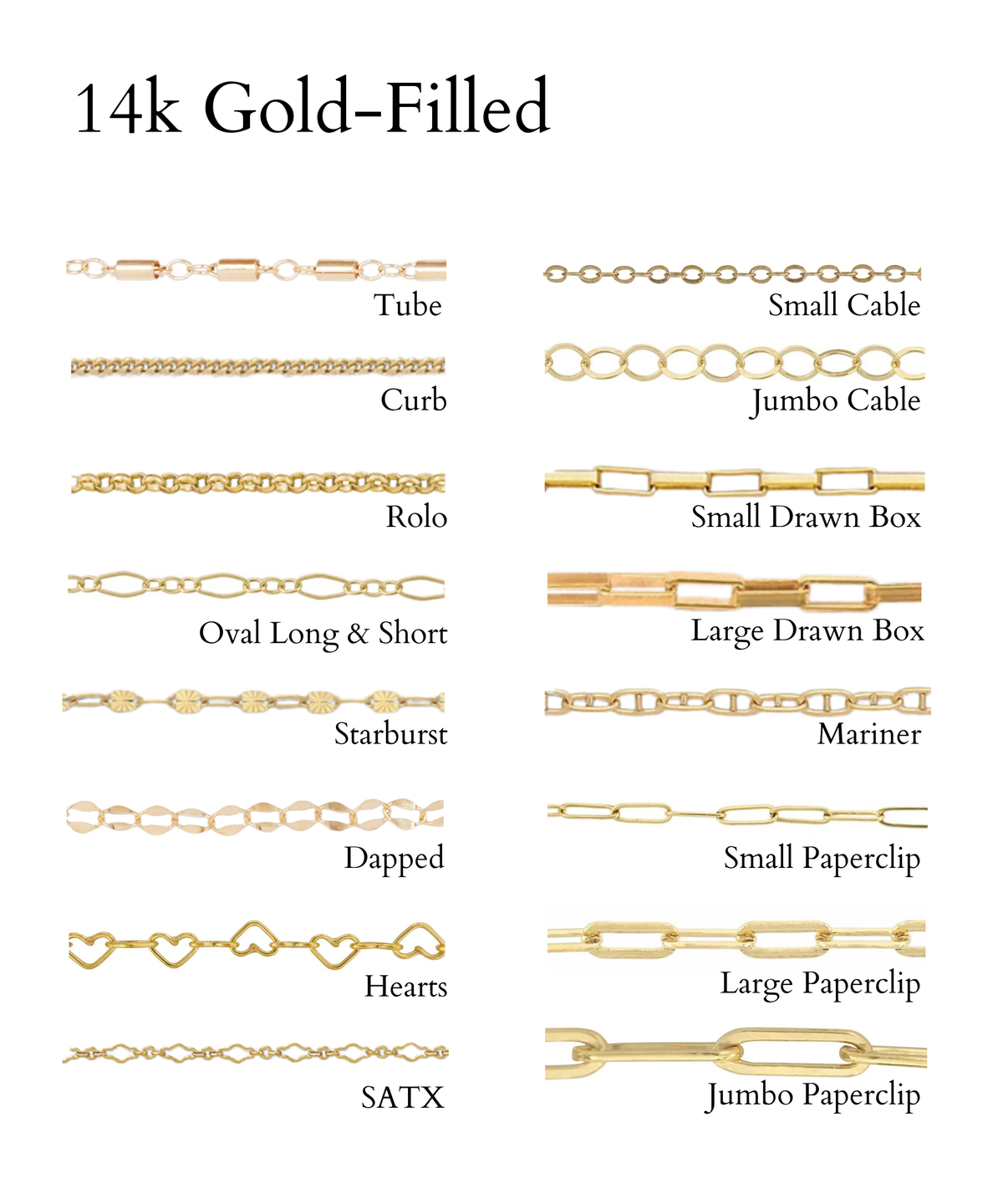 We offer an assortment of 14k gold-filled and sterling silver chains. Choose what best fits your style knowing it will stand the test of time.